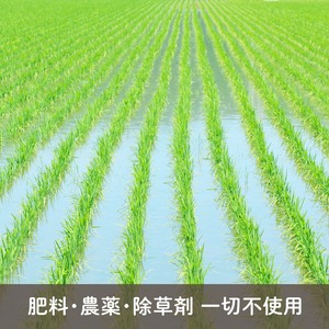 天日下に並べられた苗は清流を注ぎ込み湛水された田んぼにてミネラルを吸収しながら成長します。食べる人の健康を大切にしたお米づくりに努めています。